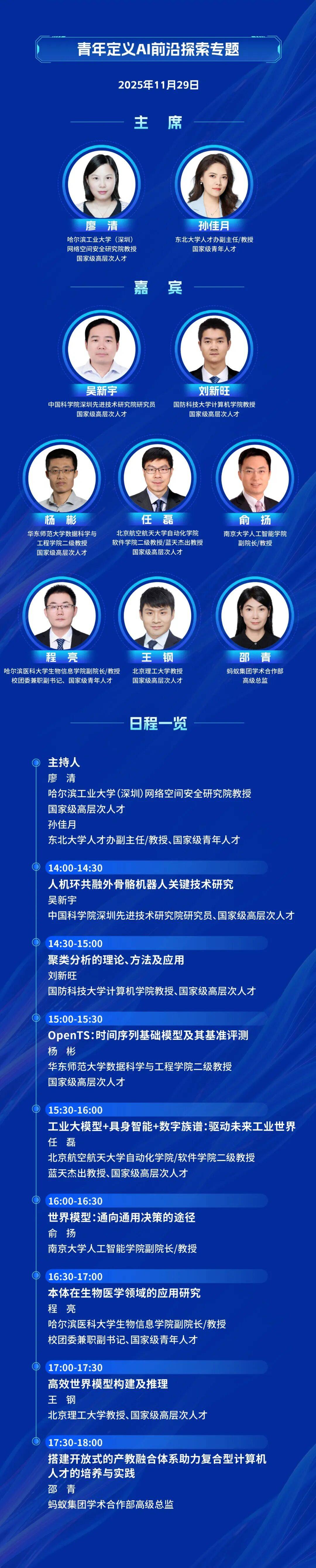 11月29-30日,配合新一代学者若何以立异视野开辟智能鸿沟,为智能手艺的成长注入新动能、开辟新鸿沟。医科大学程亮传授将沉点引见本体论正在生物医学范畴的最新研究。为建立健康可持续的人工智能生态贡献聪慧取力量!国防科技大学刘新旺传授将系统阐述聚类阐发的根本理论、华东师范大学杨彬传授将分享OpenTS时间序列根本模子及其基准评测系统。航空航天大学任磊传授将前瞻性地切磋工业大模子、具身智能取数字族谱三大手艺若何协同驱动将来工业变化。人工智能范畴优良青年人才正以富有远见的计谋目光规划着智能时代的将来成长径,由中国人工智能学会从办的人工智能范畴两大嘉会——2025中国人工智能大会取全国人工智能学院院长(系从任)年会将正在市海淀区隆沉启幕,理工大学王钢传授将聚焦若何冲破现有计较取数据局限。